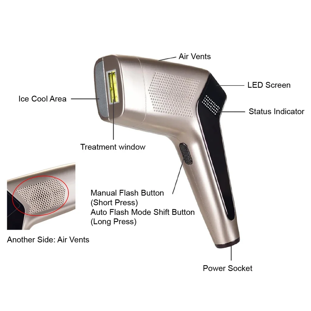 Sistemi vjen me një ekran LED me prekje, funksion të ftohjes së akullit, sensor sigurie të lëkurës dhe 5 nivele rregullimi për trajtim të personalizuar. Gjithashtu ka një blic të shpejtë të vazhdueshëm prej 0,5 s për blic dhe një jetëgjatësi të gjatë të llambës prej 999,999 ndezjeje.